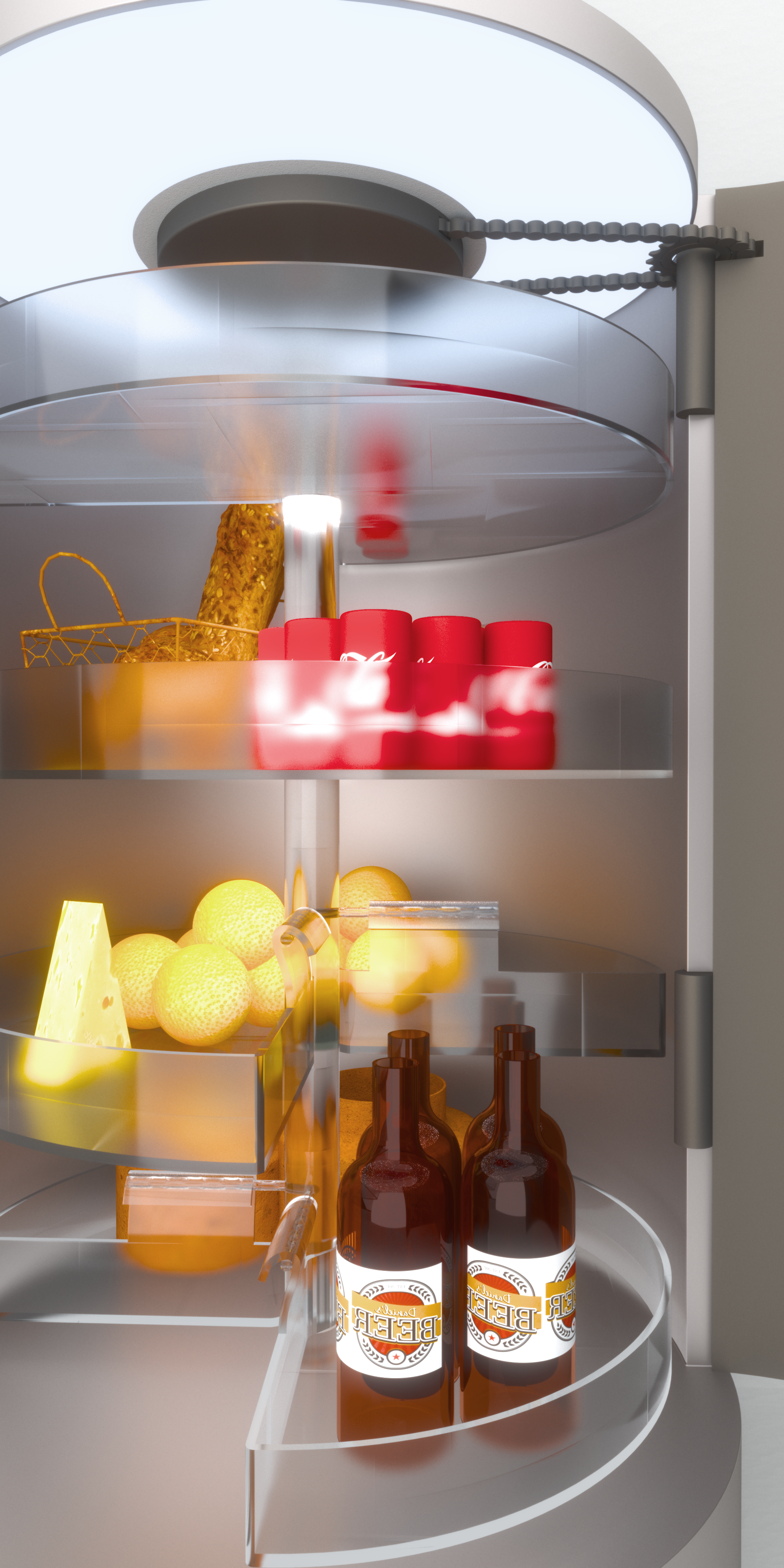 The fridge mechanism food display needs only a bicycle chain and freewheel system to reach our goal. The system can make sure food trays rotate powered by the chain when we open the door, yet if we turn the plates actively or shut the door, the chain won't work.